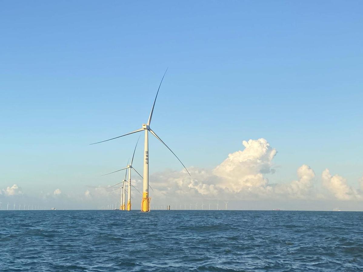 电力投资公司国有风电场200台4兆瓦风机矗立在江苏如东阳光岛,俯瞰黄海,矗立在海天之间。每转一圈可“吐出”约1000万千瓦时的电力。作为如东本地化组装率最高的海上风电场之一,其主机、塔架、叶片三大主要部件均由如东本地企业制造组装,国产化率超过90%。