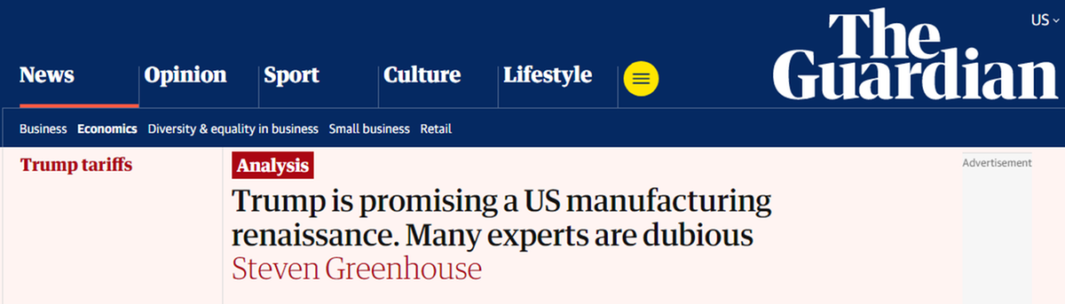 《卫报》评论说,经济学家认为,很难提出关税政策以恢复美国制造业的恢复的原因之一是其明显的变化。根据特朗普政府的说法,在100多个国家 /地区征收更高的关税将提高从海外进口的商品价格并刺激我们生产。但是,一些经济学家认为这会发生。